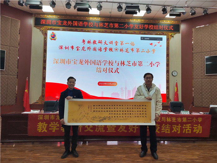 仪式在《幸福洒满祖国边疆》的歌声中开始。活动中,深圳市宝龙外国语学校和林芝市第二小学相关负责人共同签署了结对合作协议;深圳市宝龙外国语学校向林芝市第二小学捐赠了一批教学办公用品,林芝市第二小学也向宝龙外国语学校赠送了纪念品——书法作品《满江红》。