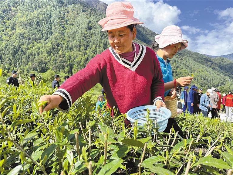在墨脱县格当乡德吉村,茶农在采摘春茶。王凯 本报记者 王敏 摄