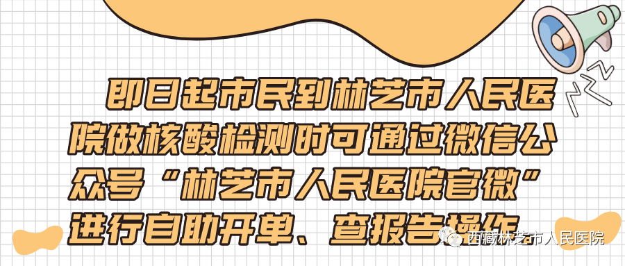 为了市民做核酸检测方便、快捷,避免人群聚集,市民到医院做核酸检测时可通过微信公众号“林芝市人民医院官微”进行自助开单、查报告操作。