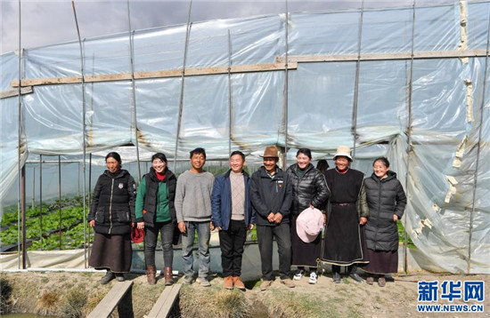 陈千(左四)和甲日卡村村民及温室大棚种植户在大棚前合影(2月25日摄)。新华社记者 晋美多吉 摄