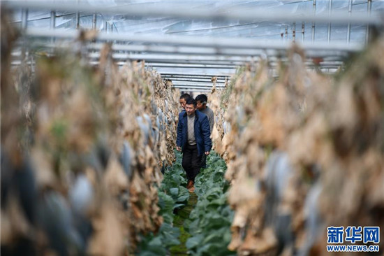 陈千(前)和种植户在大棚里查看蔬菜长势(2月25日摄)。新华社记者 晋美多吉 摄