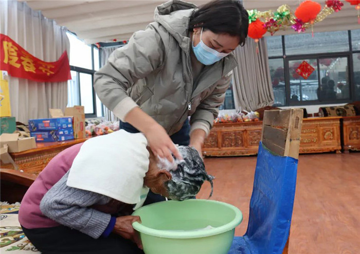 “叔叔,您看这水会不会太凉了”“阿姨,洗完头到这边,我帮您把头发吹干”。一声问候,两句寒暄,党员们亲切询问老人的身体情况,叮嘱老人们在冬春转季要注意保暖。