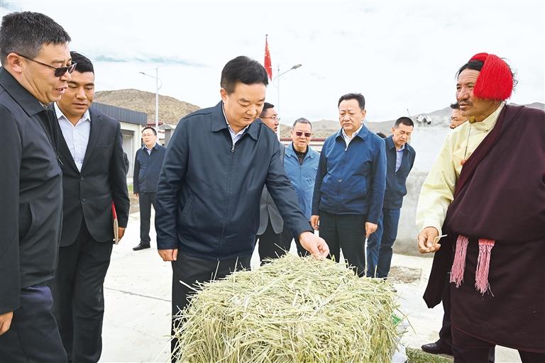 6月18日至21日,自治区党委书记王君正深入日喀则市桑珠孜、定日、吉隆、萨嘎、昂仁、拉孜等地调研。这是王君正在萨嘎县加加镇杰村了解养羊合作社运营情况。本报记者 李洲 摄